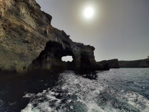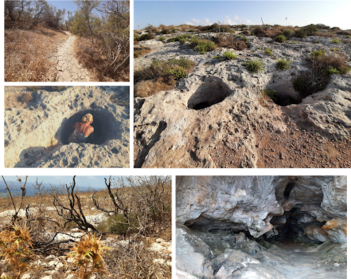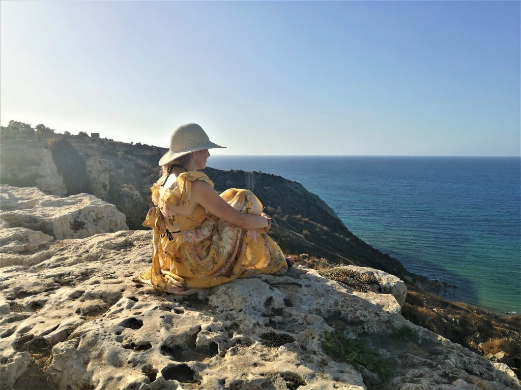 Chodząc wśród wielkich wapiennych bloków świątyń, czułam, że jestem w zupełnie innym świecie. Przebywanie wśród natury, wdychanie zapachu nieznanych mi ziół, zawieszenie w czasie, wędrowanie nieznaną drogą, pływanie w morzu przy Ramla Bay sprawiły, że czułam absolutną radość, co nie powinno dziwić, bo maltańska nazwa wyspy “Għawdex” właśnie radość oznacza. Szukając właściwej drogi, przedzierałam się przez dzikie chaszcze. Aż dotarłam do pól, które niedawno strawił ogień. Wrażenie potęgowały unoszący się w powietrzu intensywny zapach spalenizny, widok osmolonych palm, sukulentów i gałęzi drzew. Dotarło do mnie, że wielka, bogata w zasoby planeta może przestać istnieć. Niszczymy coś, co wydaje nam się dane na zawsze. Wysuszone rośliny, popękana ziemia przywoływały na myśl wygląd świata, w momencie rzucenia na niego klątwy przez Demeter, gdy nie mogła odnaleźć swojej córki. Jednak dotarcie do jaskini, widok na klify i morze przywołało inną archetypiczną postać, która dla mnie równie mocno zespolona jest z przyrodą, a przez Maltanki i Maltańczyków uważana jest za mieszkankę Gozo.